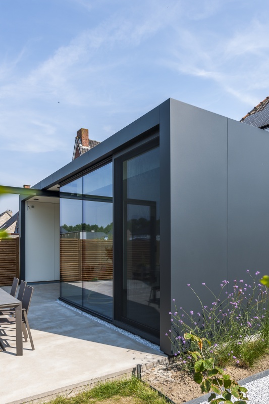 De bestaande tuinberging en achterbouw wordt afgebroken om plaats te maken voor een nieuwe uitbreiding. De reeds ingerichte keuken dient hierbij behouden te blijven wat een extra uitdaging vormt in de werf-fase. De bestaande garage wordt omgebouwd tot een nieuwe bureauruimte.